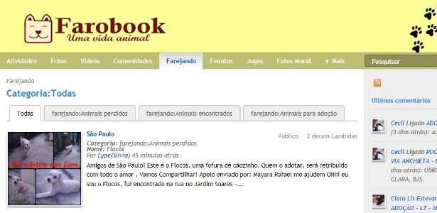animais. Uma moça já adotou um animal por aqui [o Farobook]".