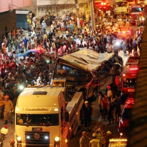 Bombeiros removem do local do acidente o ônibus que caiu de um viaduto na pista lateral da avenida Brasil
