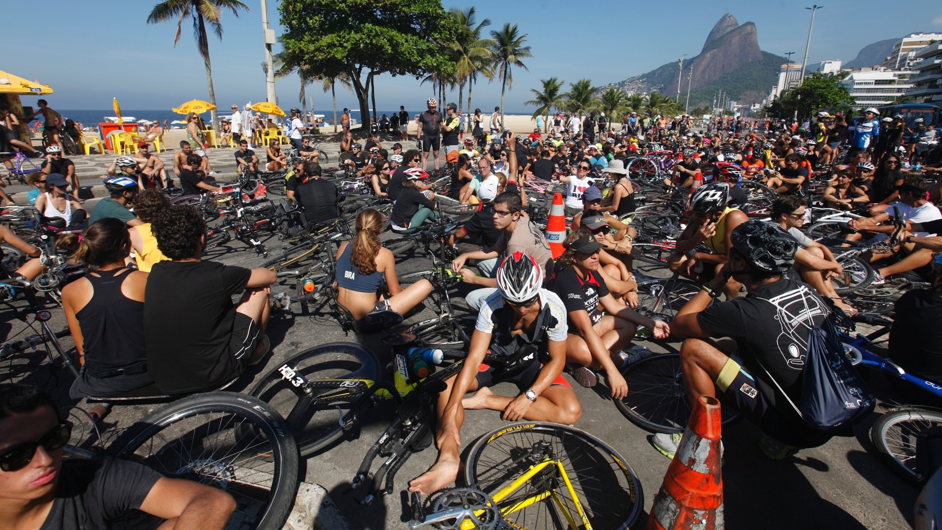 ontem durante um treinamento em Ipanema. Centenas de ciclistas se